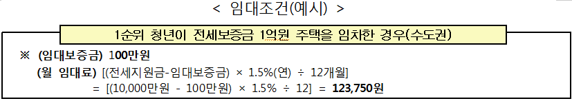 임대기간은 최장 6년이나 특정 조건을 충족할 경우 20년까지 거주할 수 있으며 지원한도액은 청년 유형과 동일하다.임대료 계산하기(예시)