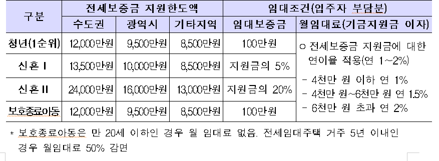 임대조건은 보증금 100만 원, 임대료는 전세지원금의 1~2% 수준이다.임대기간은 최장 6년이며 지원한도액은 수도권 기준 1억 2천만 원까지이다.