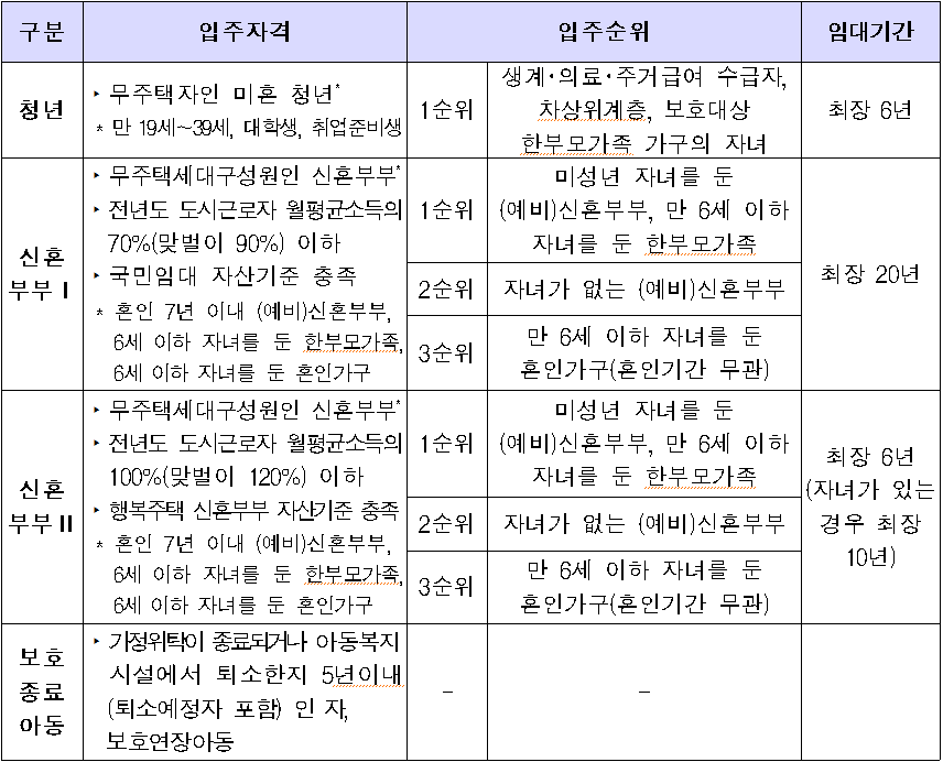 신청자격은 △청년(1순위) △신혼부부(Ⅰ·Ⅱ) △자립준비청년이다.현재 거주하고 있는 지역과 상관없이 전국 소재 주택에 신청할 수 있다.