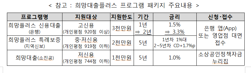 '희망플러스 신용대출'은 22년 1월 시행한 희망대출플러스 프로그램 패키지의 일환으로,코로나19 피해를 입은 고신용 소상공인에 대해 최대 3천만 원까지 저금리 자금을 공급하는 은행 신용대출 프로그램이다.