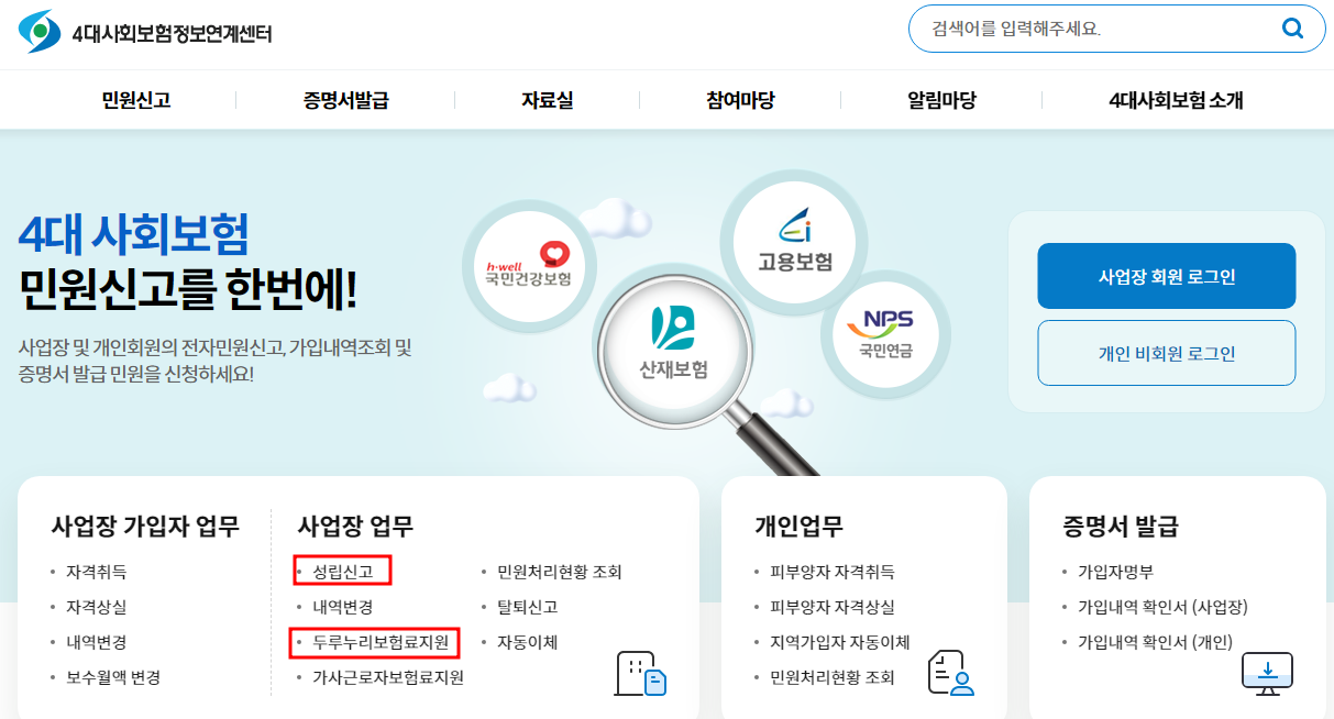 미가입 사업장 : 4대 사회보험 정보연계센터 홈페이지 > 사업장 업무 > 성립신고 (두루누리보험료지원 체크)기가입 사업장 : 4대사회보험 정보연계센터 홈페이지 > 사업장 업무 > 두루누리보험료지원