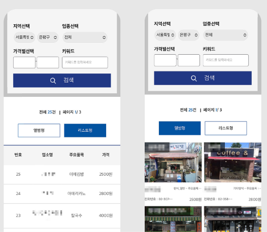 광역시/도 선택 > 구 선택 > 업종과 가격대 선택(선택하지 않으면 모든 업소가 조회돼요) > 검색 버튼