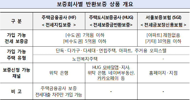 또한 전세금안심대출(HUG 보증 전세대출) 이용 차주 또는 등록 임대주택에 거주하는 임차인의 경우이미 반환보증이 가입되어 있을 수 있으니, 먼저 보증가입 여부를 확인하는 것이 좋다.